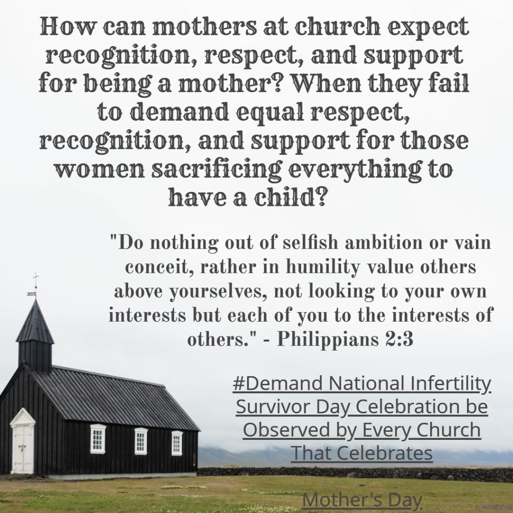 The bible tells us to “count other more significant than yourselves.” So I ask Christian mothers do you count infertile women more significant than yourselves? Have you asked yourself or the Christian women at your church, what you can do to help them? Have you met with your church pastor and asked what they are doing to support the couple with a failed frozen embryo treatment or the couple who is struggling to afford the adoption fee for domestic infant adoption that serves and helps parents at the church? Change will not happen in our church unless mother’s help push for the change.